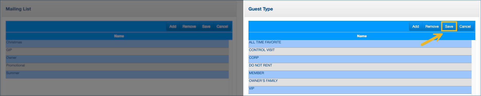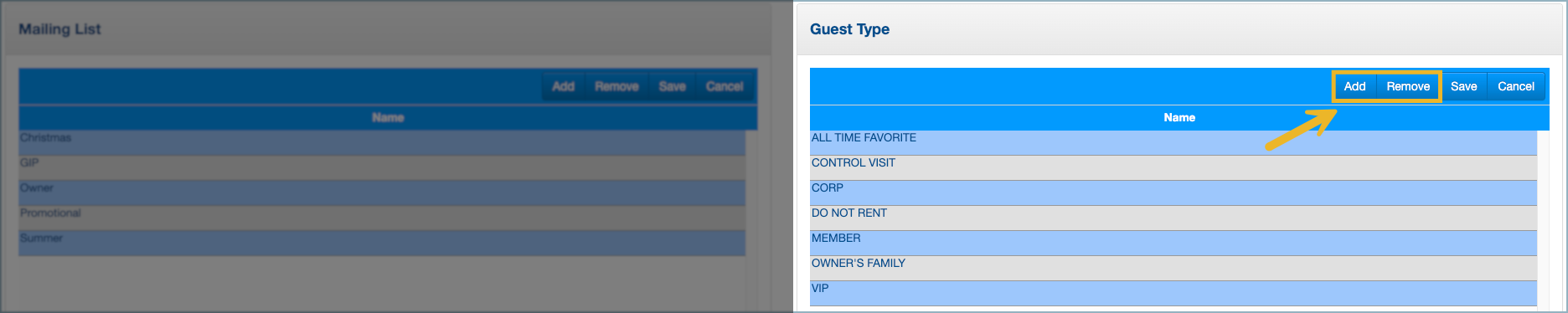 1. To create a new Guest Type, click Add, then enter the name in the blank row that appears at the top of the list. To remove a Guest Type, select it and click Remove.