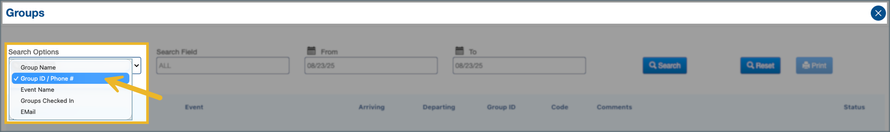 1. In the Search dropdown, you’ll see five criteria options (for example: group name, event, confirmation number, contact name, and phone number). Select Phone Number as your search criterion.