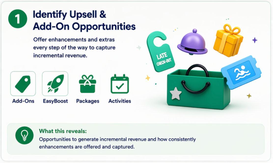Features such as Add-Ons, EasyBoost, Packages, and Activities provide structured ways to present enhancements during the reservation process or at check-in.