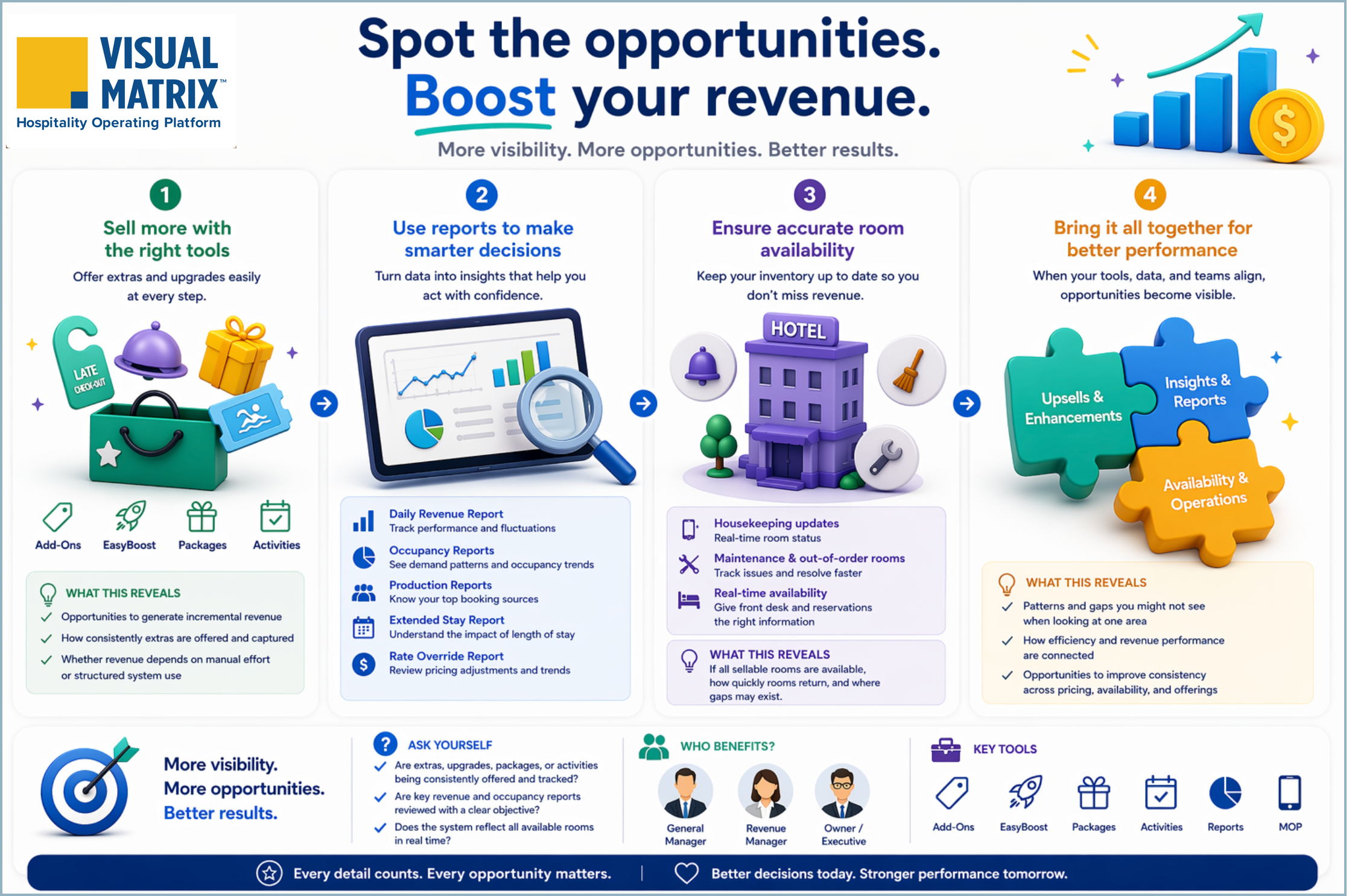 Revenue opportunities in hospitality are not always lost due to strategy—they are often missed due to limited visibility. Visual Matrix Cloud brings together pricing tools, reporting insights, and operational data in one place, helping properties uncover opportunities for additional revenue. Understanding where to look within the system can help highlight opportunities that might otherwise go unnoticed.