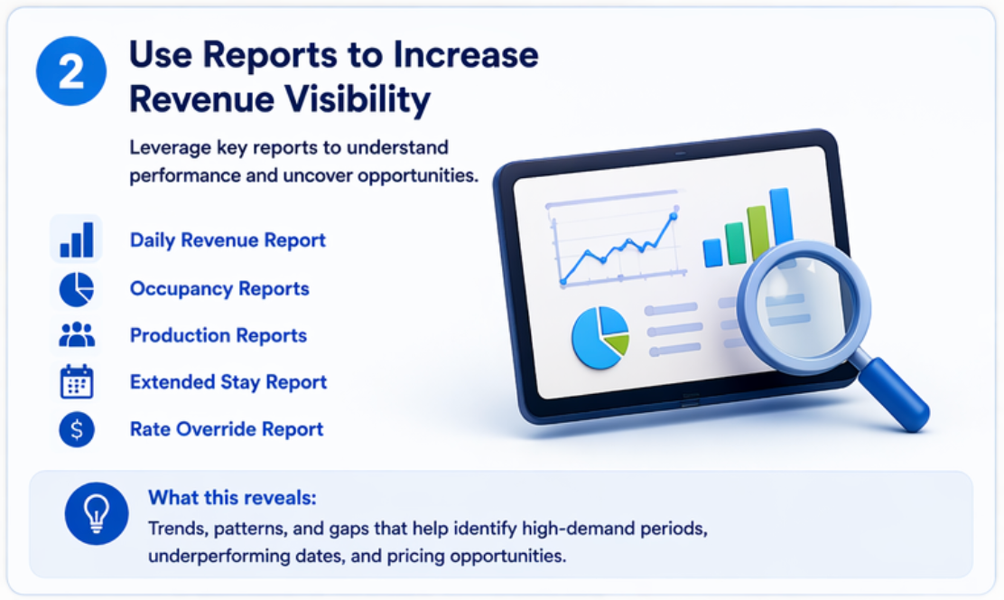 - The Extended Stay Report can highlight whether longer stays are contributing as expected to overall revenue