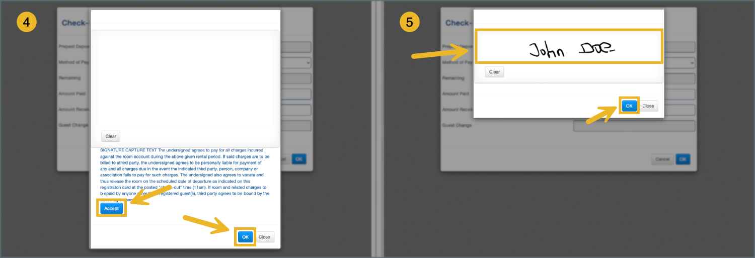 5. Once the acceptance terms are confirmed, the signature pad appears. Ask the guest to sign directly on the tablet, then click OK to submit the signature.