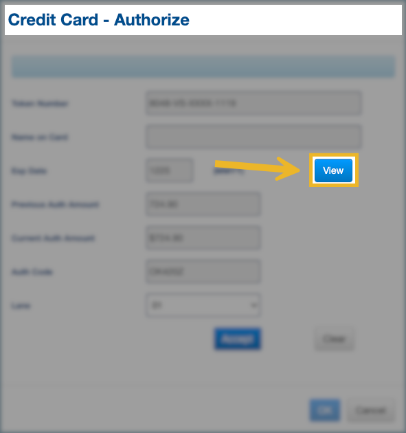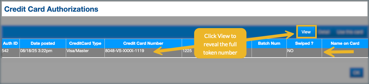 4. Select the card and click View again in the Credit Card Authorizations window to reveal the full token number. Click OK to close.