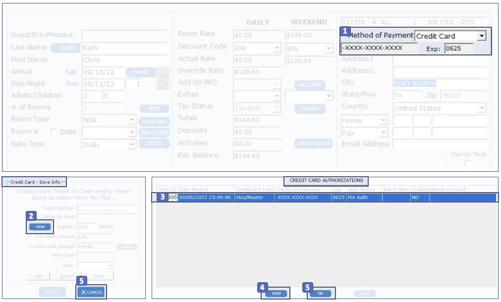 ? Watch Video Path: Front Office > Cashiering > Guest/Group Account > Open a Folio 1. Click on the Credit Card transaction to display it in the Details Posting at the bottom. 2. Click on View on the right side. 3. In the Credit Card Authorizations ...