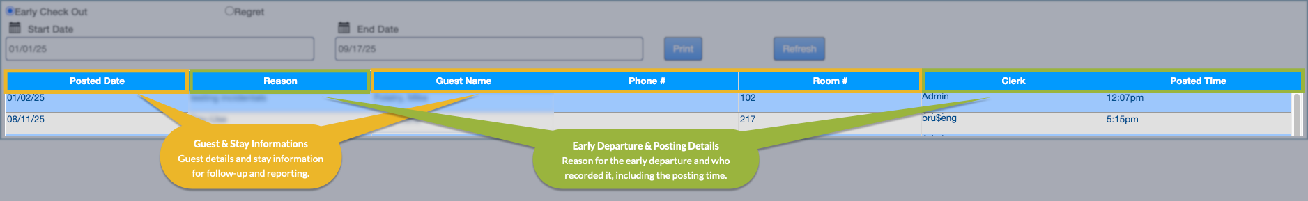The Early Check-Outs Loss of Business report lists all guests who checked out before their scheduled departure date within the selected date range. Use the screenshot below to understand how each section of the report is organized.