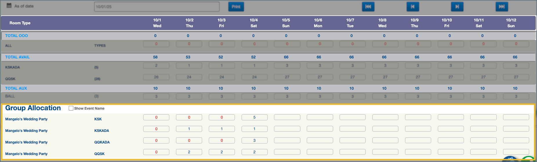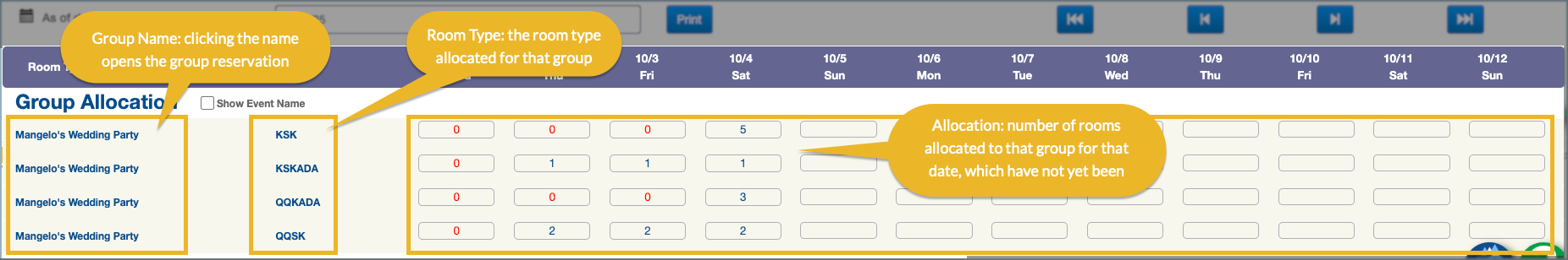 - Allocation: number of rooms allocated to that group for that date, which have not yet been picked up