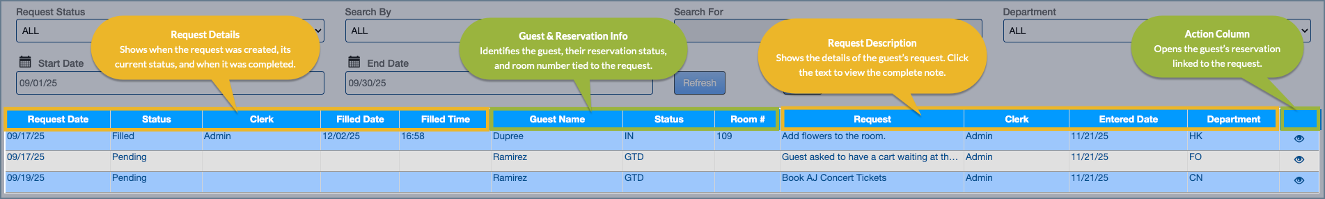 The Special Requests report displays all requests matching your filters, helping you identify pending work, follow up on completed tasks, and maintain a clear service record.