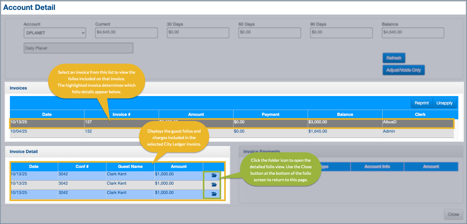Invoice Folio Detail is a read-only reference view. It does not allow editing charges, applying payments, or adjusting invoice balances.
