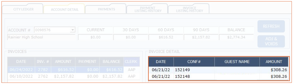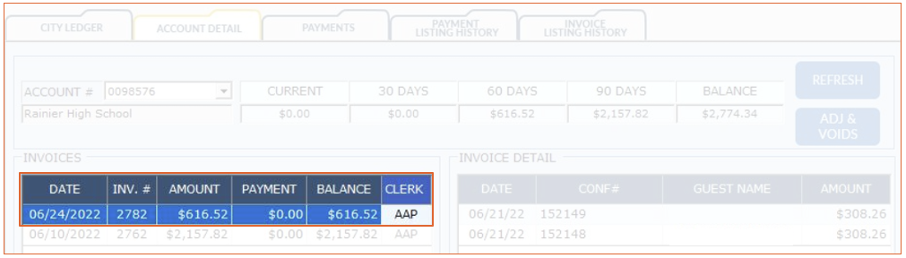 ? Watch Video Account Detail will show you the Invoices on the Account that have a balance due. Path: Accounting > City Ledger > Account Listing > Open a CL Account > go to Account Details Select an Invoice # to view: - Invoice details (bottom ...