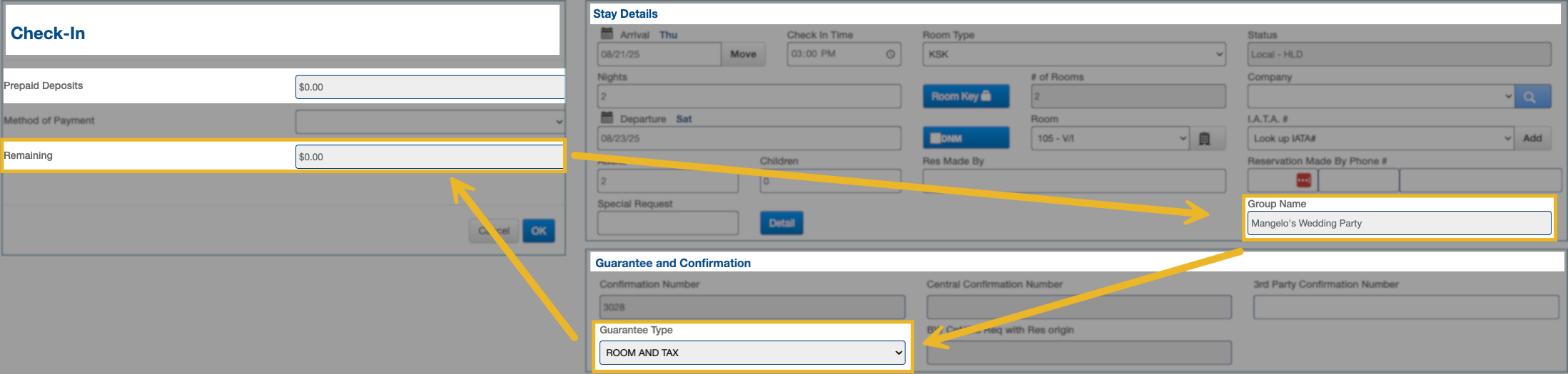 When the Guarantee Type is set to Room & Tax (or All Charges), no credit card is required at check-in because room and tax will post to the group master folio.