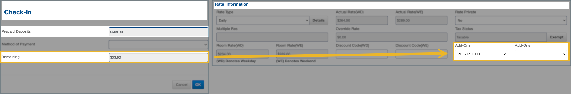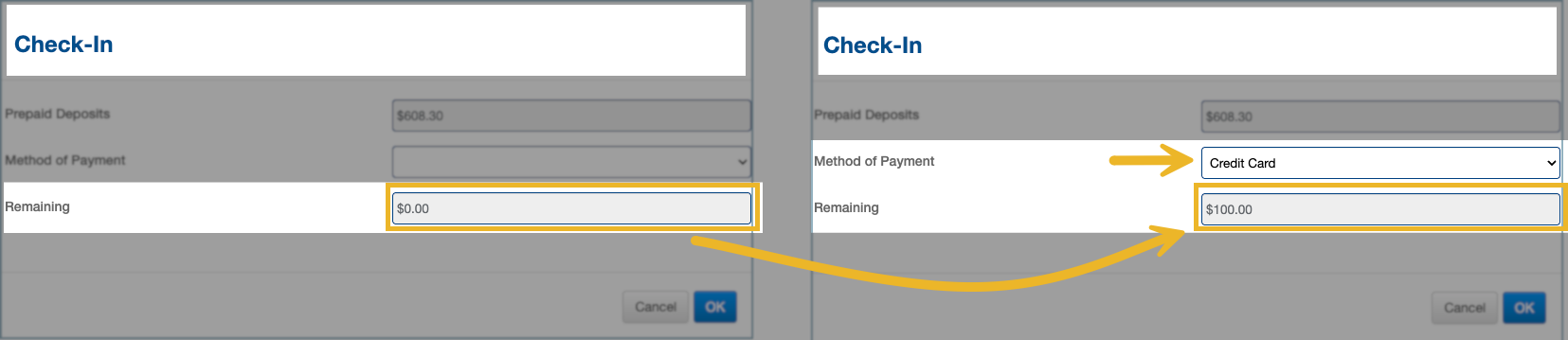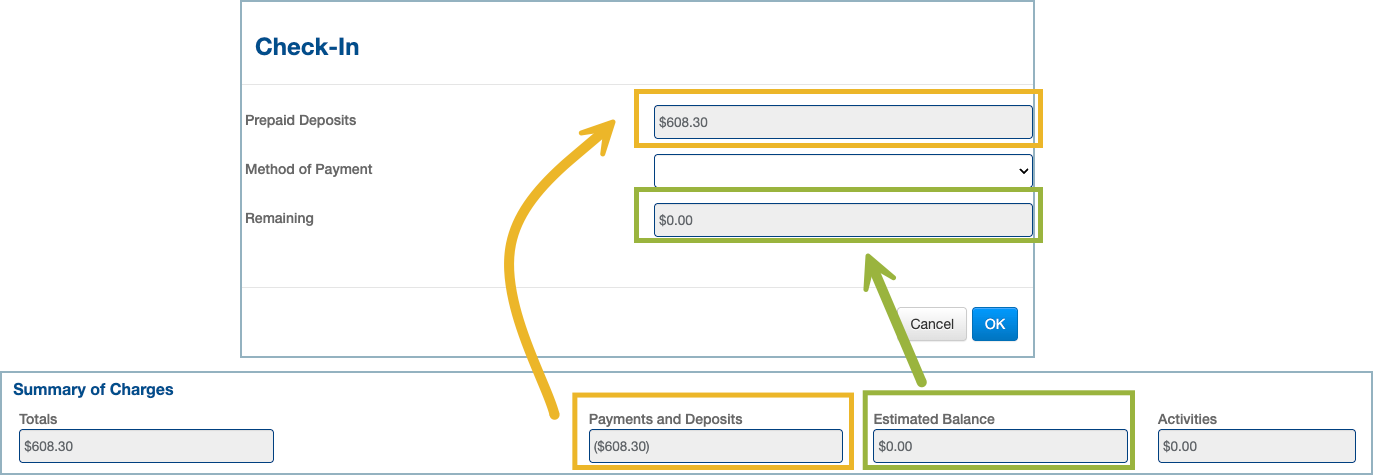 - If no incidental amount is configured, or the Guarantee Type is All Charges, complete the check-in as Cash and then manually add the credit card to the reservation afterwards.