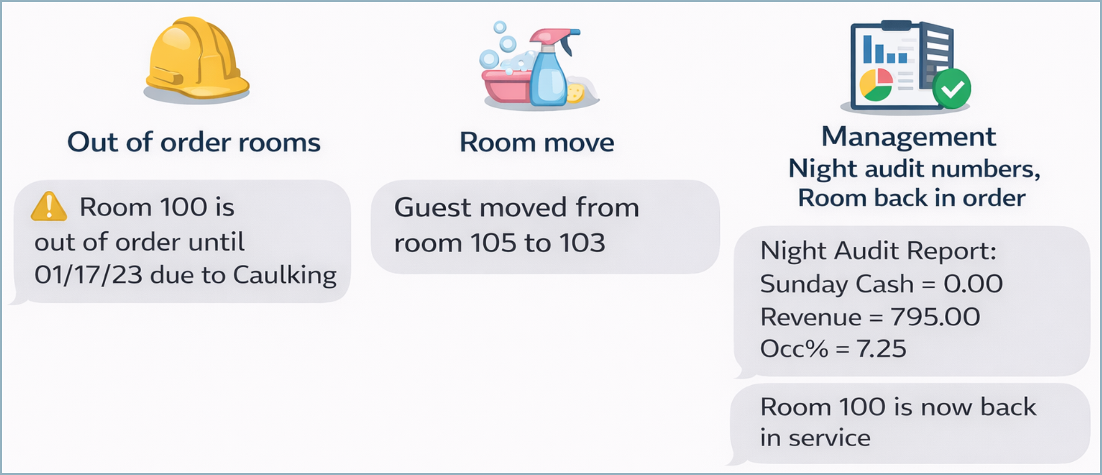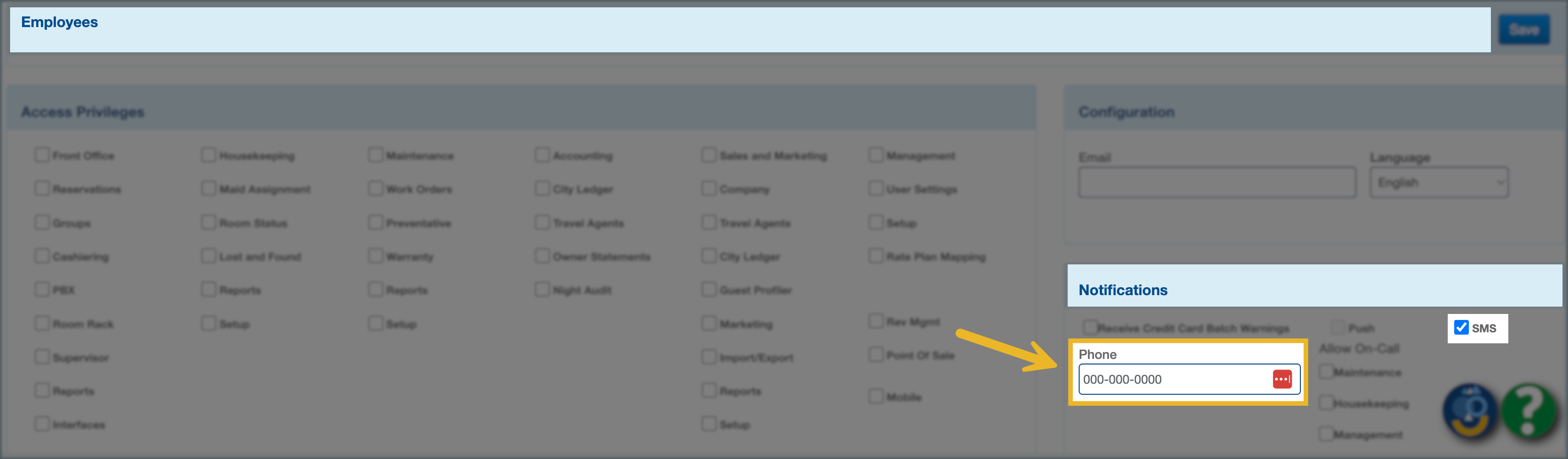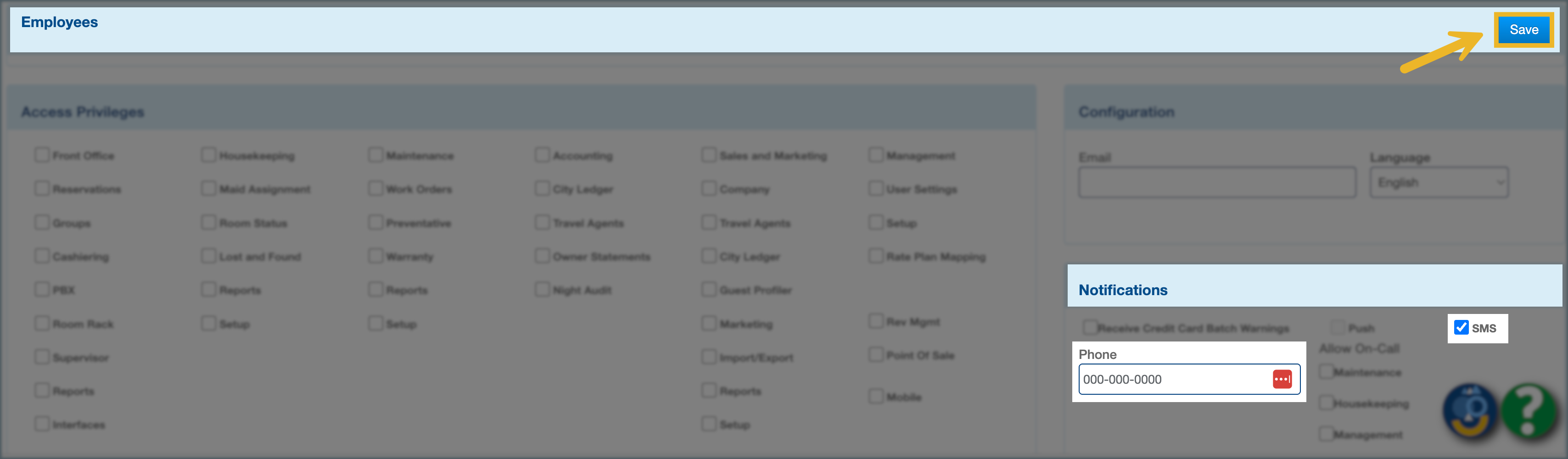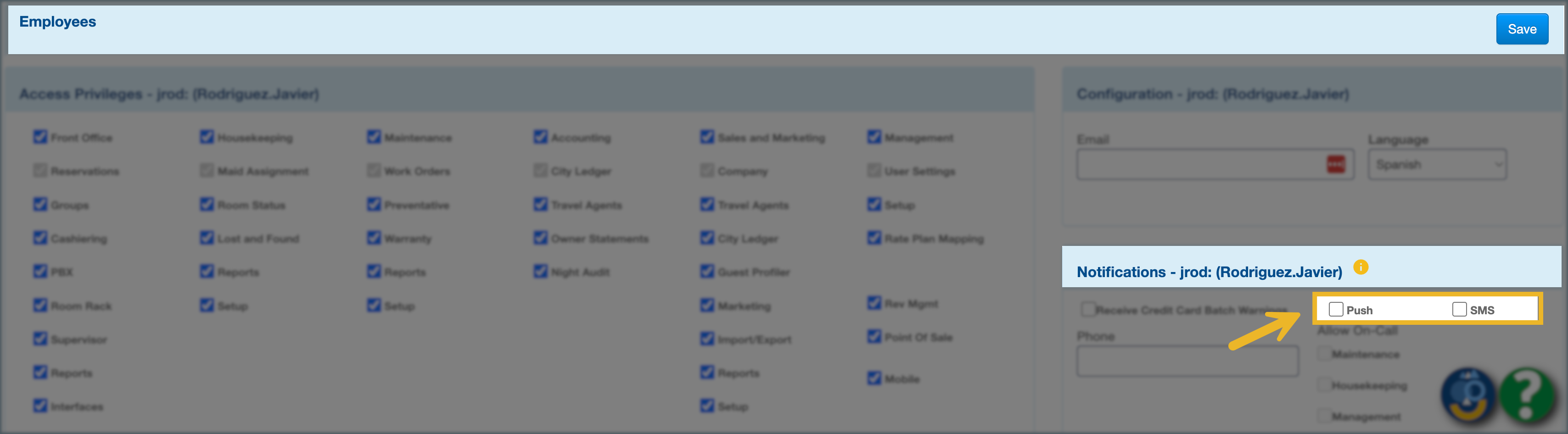 Text and push notifications allow users to receive system alerts related to housekeeping, maintenance, and management activity. This setup determines which users are eligible to receive notifications, how those notifications are delivered (Push or SMS), and the types of alerts each user will receive.