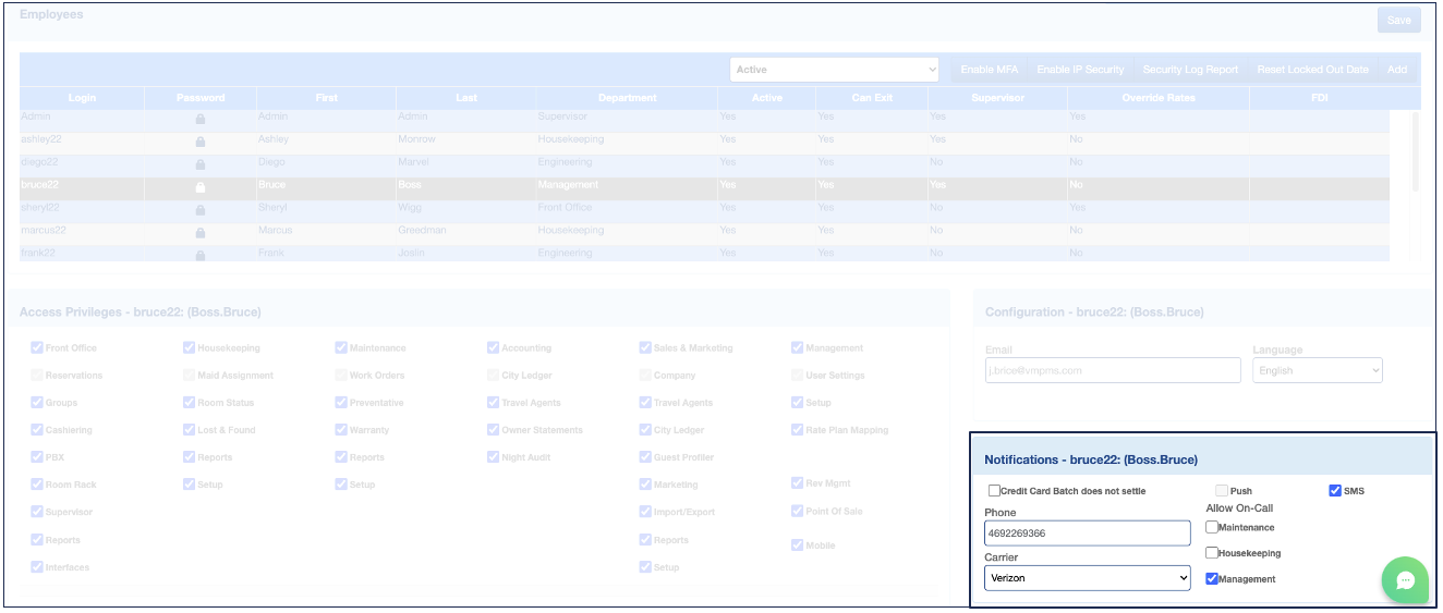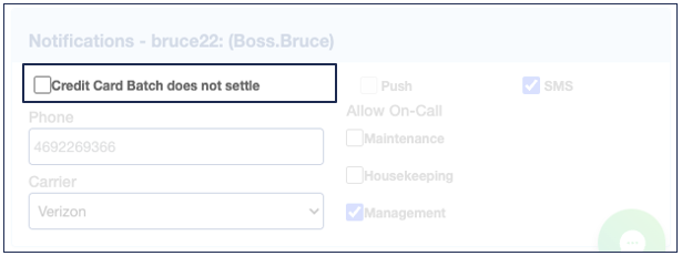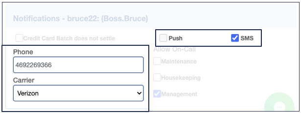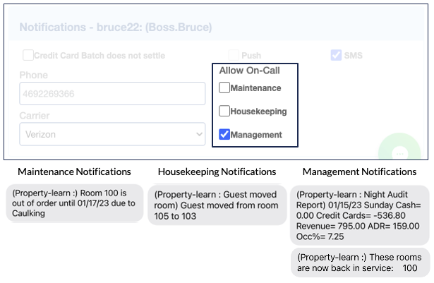 This section allows you to designate which users can receive SMS or push notifications in three key areas: Housekeeping, Maintenance, and Management. Note that this setup determines who is eligible to receive notifications but does not activate them. To enable notifications, you will need to activate each user in the On-Call section.