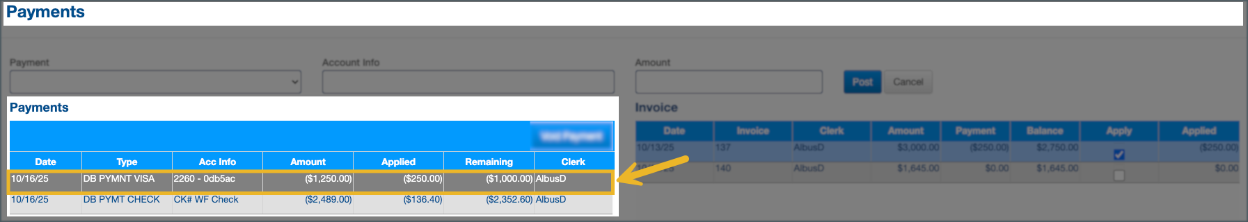 1. Locate the Payment to Void. In the Payments section of the Account Detail screen, find the payment you want to void.