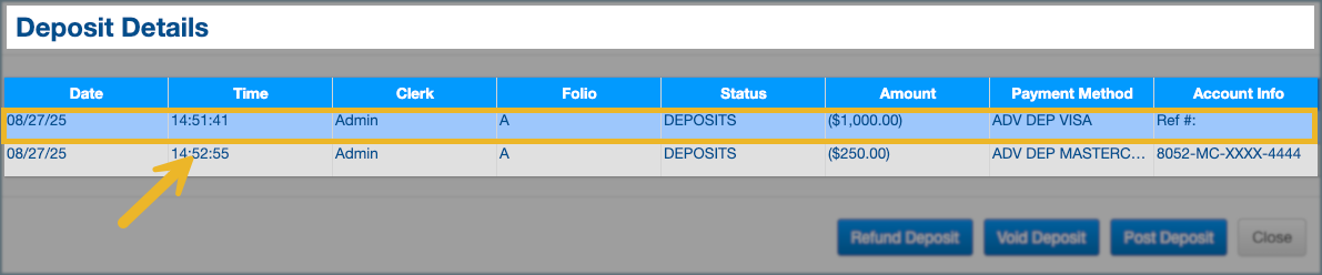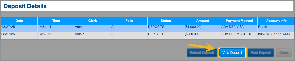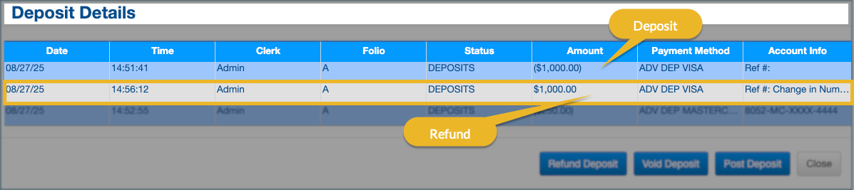 The Deposit Details screen lets you view and manage all Group Advance Deposits applied to the Group Master Folio. From this screen, you can review posted deposits, and—if needed—post, refund, or void a deposit directly without leaving the group ...