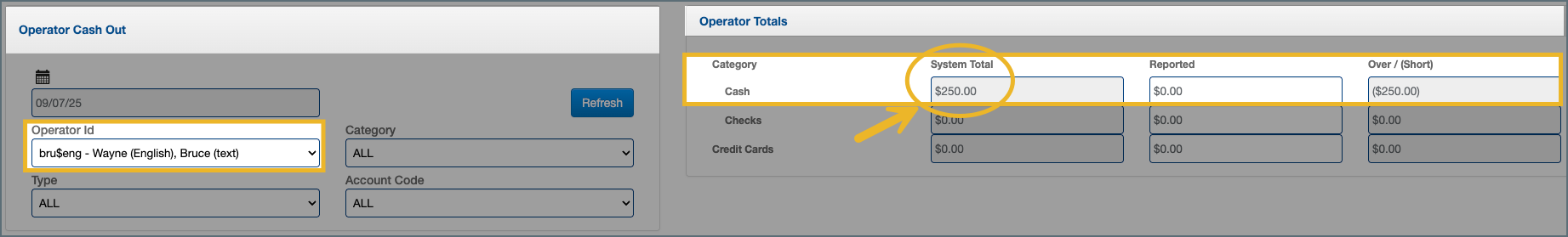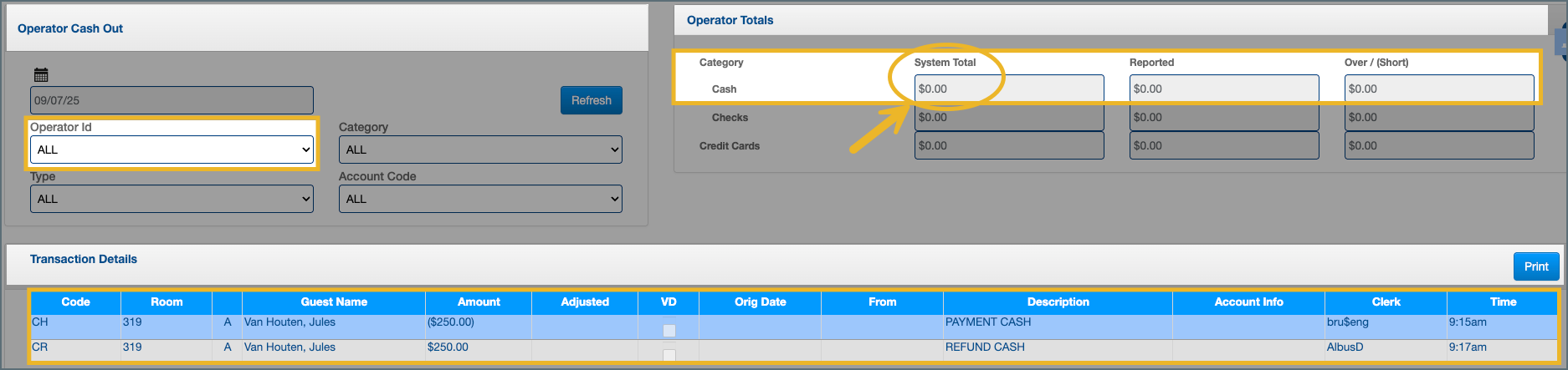 Both transactions will appear under their respective usernames in the Operator Cash Out report, but together they cancel each other out. This ensures the overall property balance and audit trail remain accurate once the day closes.