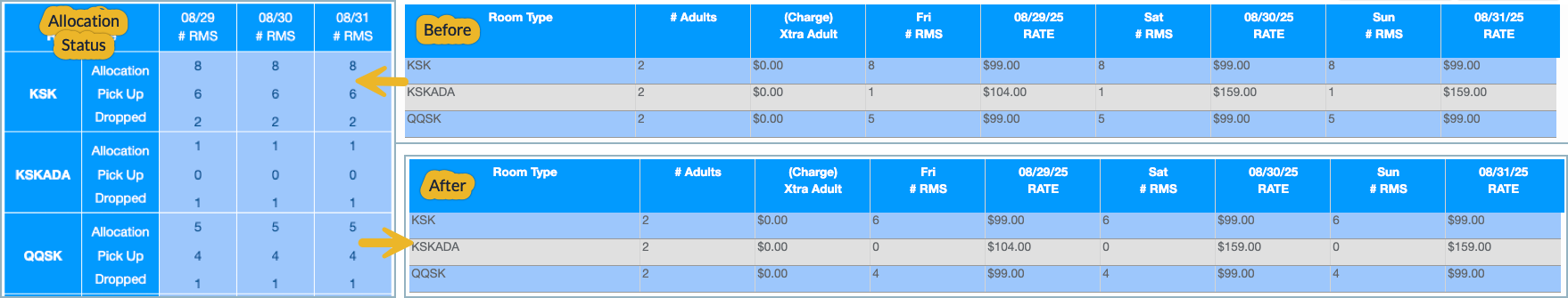 4. The system updates the group so that Allocations = Picked-Up Rooms. This ensures the group reflects its final, accurate pickup total.