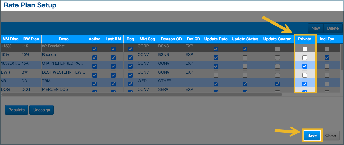 2. For every rate plan you need to make private, check the Private box. This ensures the rate will be hidden on registration cards. Click Save when finished.