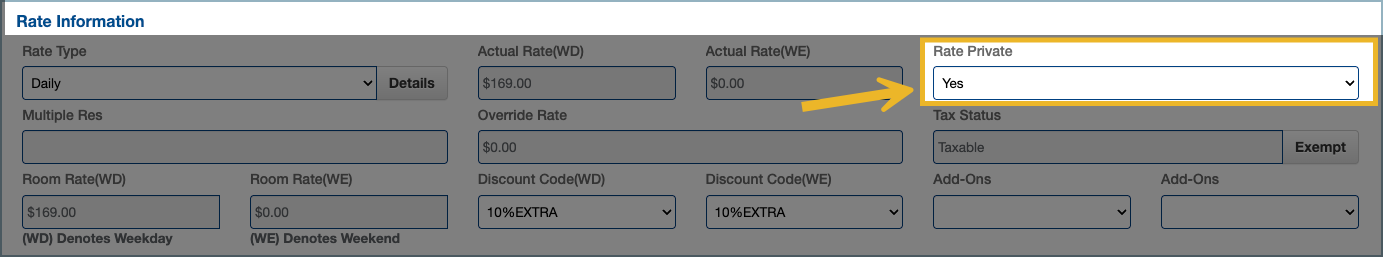 2. Mark the rate as Private: In the Rate Private field, select Yes to hide the rate (or No to show it). The change saves automatically.