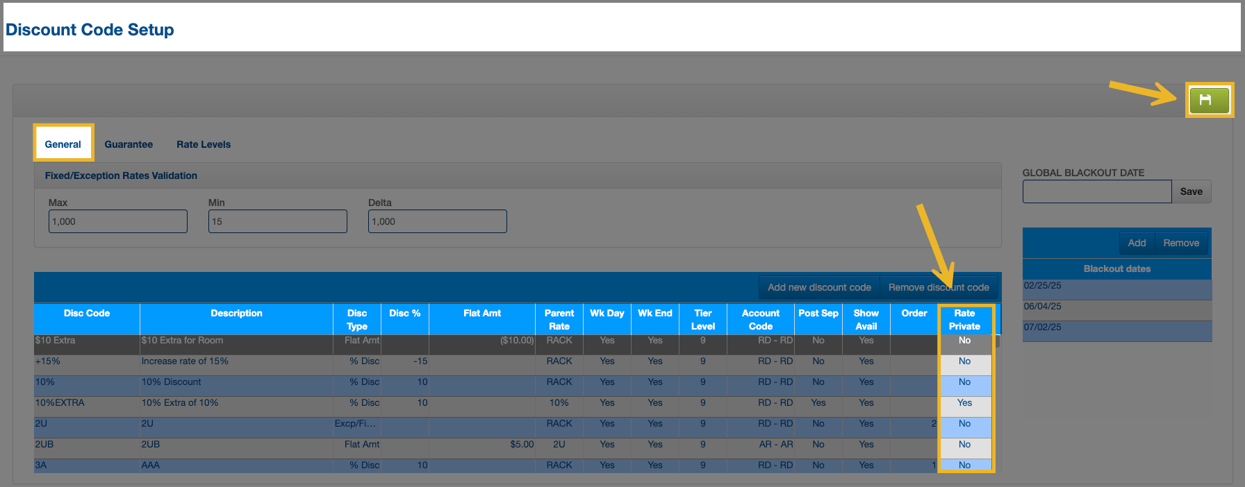 2. Update every rate status as needed and click on the green floppy disk to save.