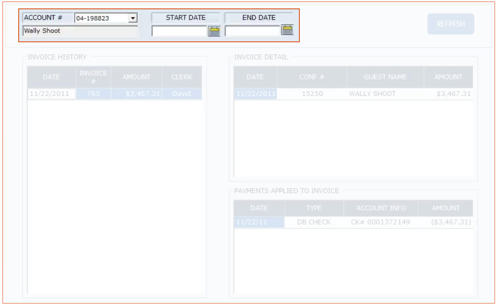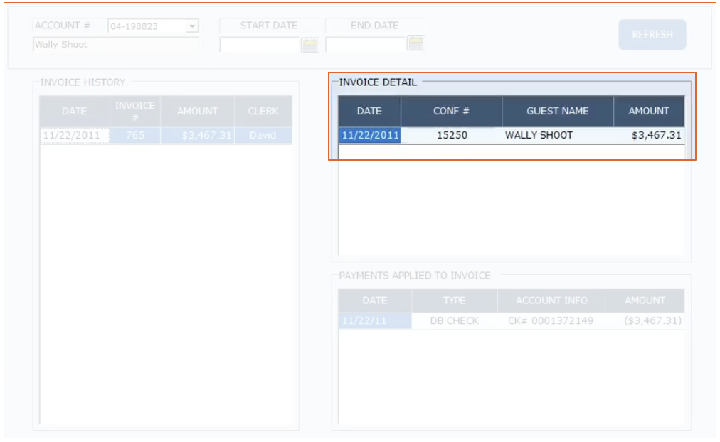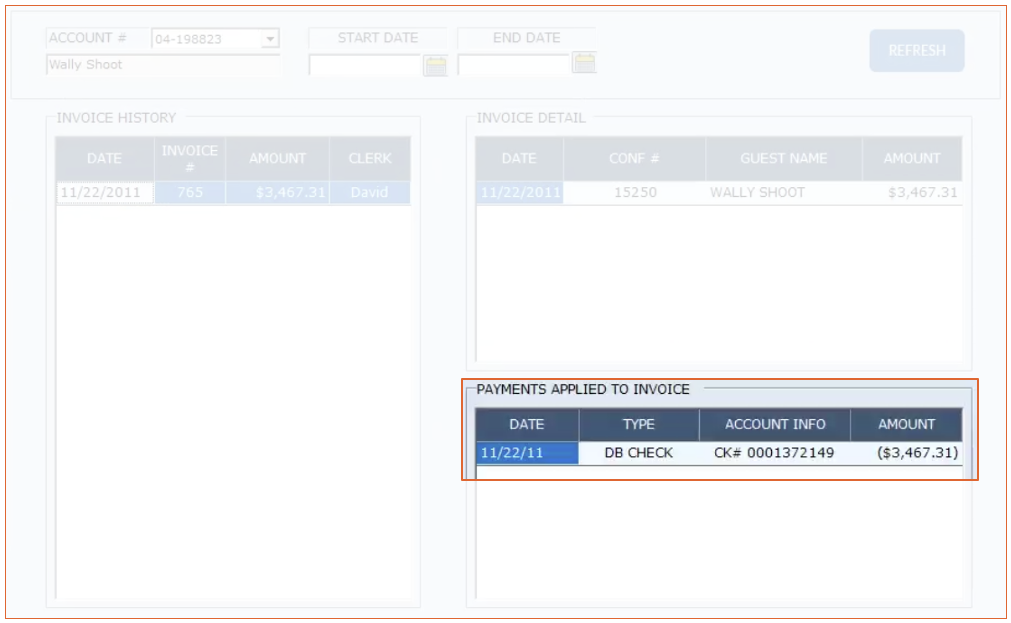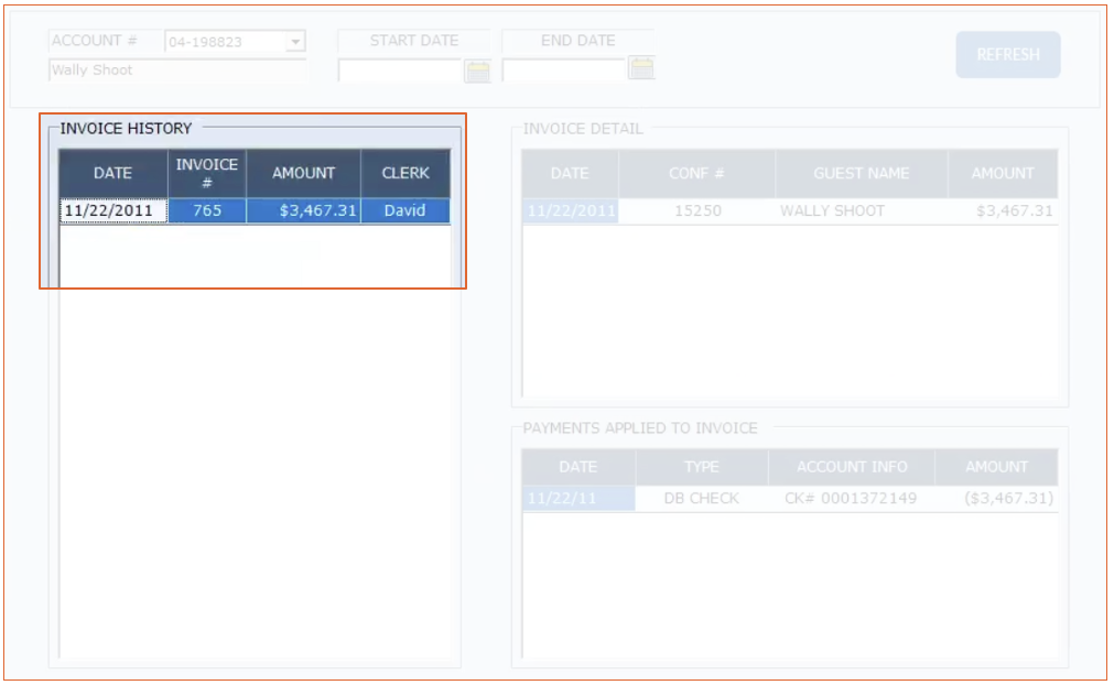 The Invoice History is a list of fully paid invoices for the city ledger account. Any invoice not completely paid will remain in the account details section.