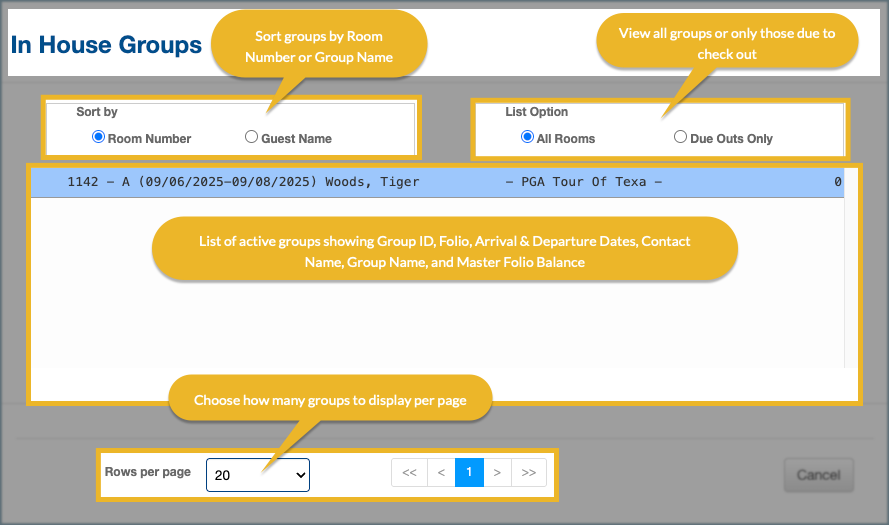 The In-House Groups window lists all active groups currently checked in at the property. Use the options shown below to sort, filter, and navigate the list to quickly find the group you need.