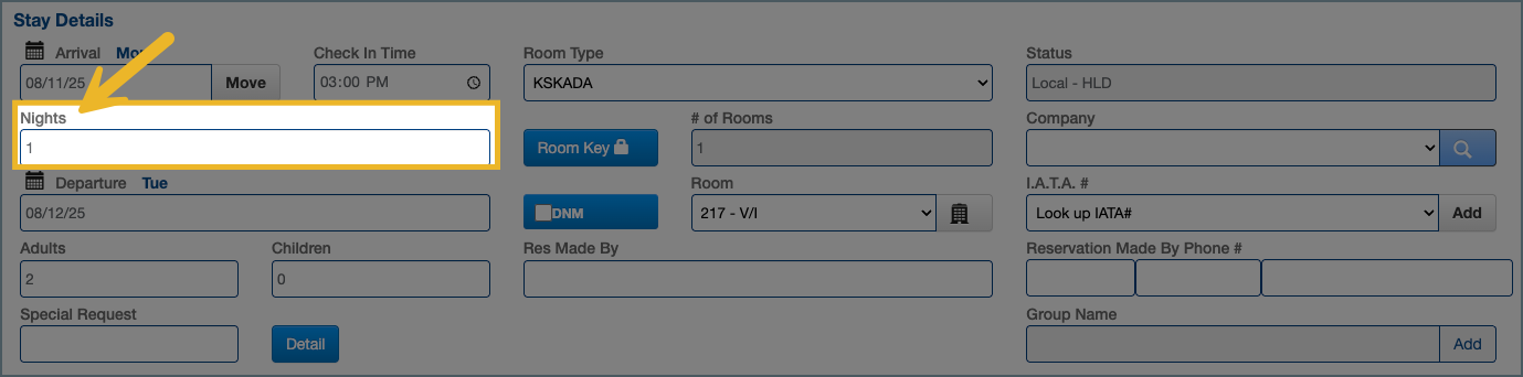 After checkout, the reservation automatically updates from 1 night to 0 night, with the departure date set to match the arrival date. This ensures the system accurately reflects the guest’s actual stay duration.