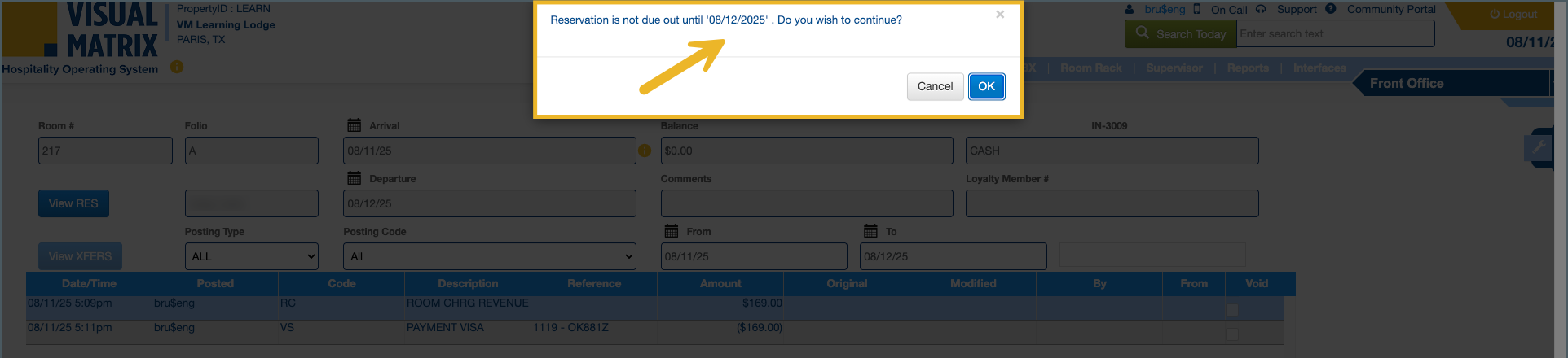 3a. When you select Checkout, a prompt will appear: “The reservation is not due out until [departure date]. Do you wish to continue?” Select OK to proceed. This confirmation step ensures you are intentionally checking the guest out before the scheduled departure date.
