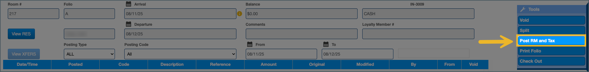 If your property does not use the feature that automatically posts room and tax charges at check-in, you’ll need to post them manually. To do this, select Post Room & Tx from the folio toolbar. This ensures room and tax charges are properly recorded on the guest’s folio during their stay.