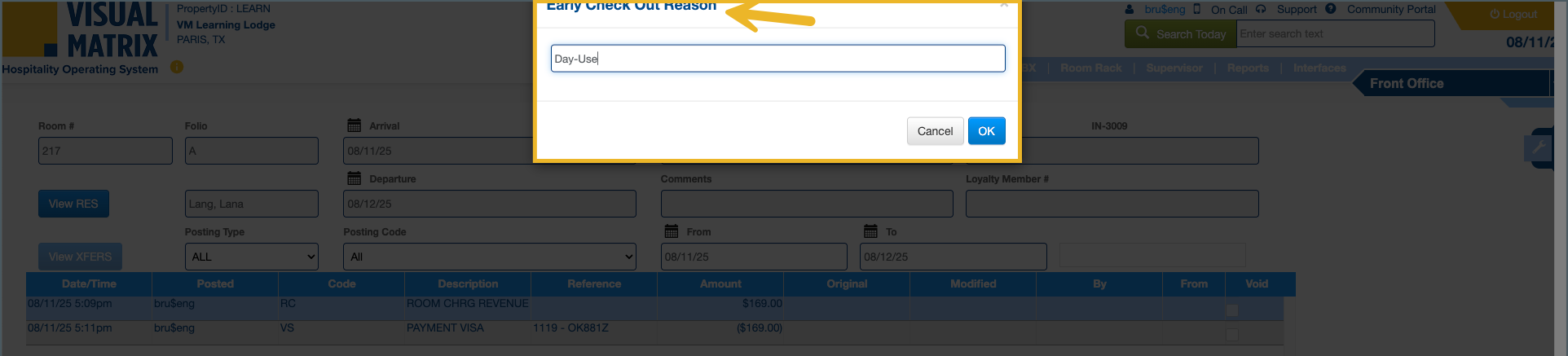 Before completing the checkout, enter an Early Check Out Reason in the reservation and click OK. This records why the guest is leaving early, supporting accurate records and better guest service management.