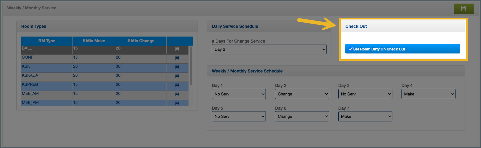 If this setting is not turned on, a room that was occupied will remain marked as Clean until the night audit runs. For day-use stays, this creates a risk: after checkout, the room may still appear as available and clean to the front desk, even though it should be out of service for cleaning.