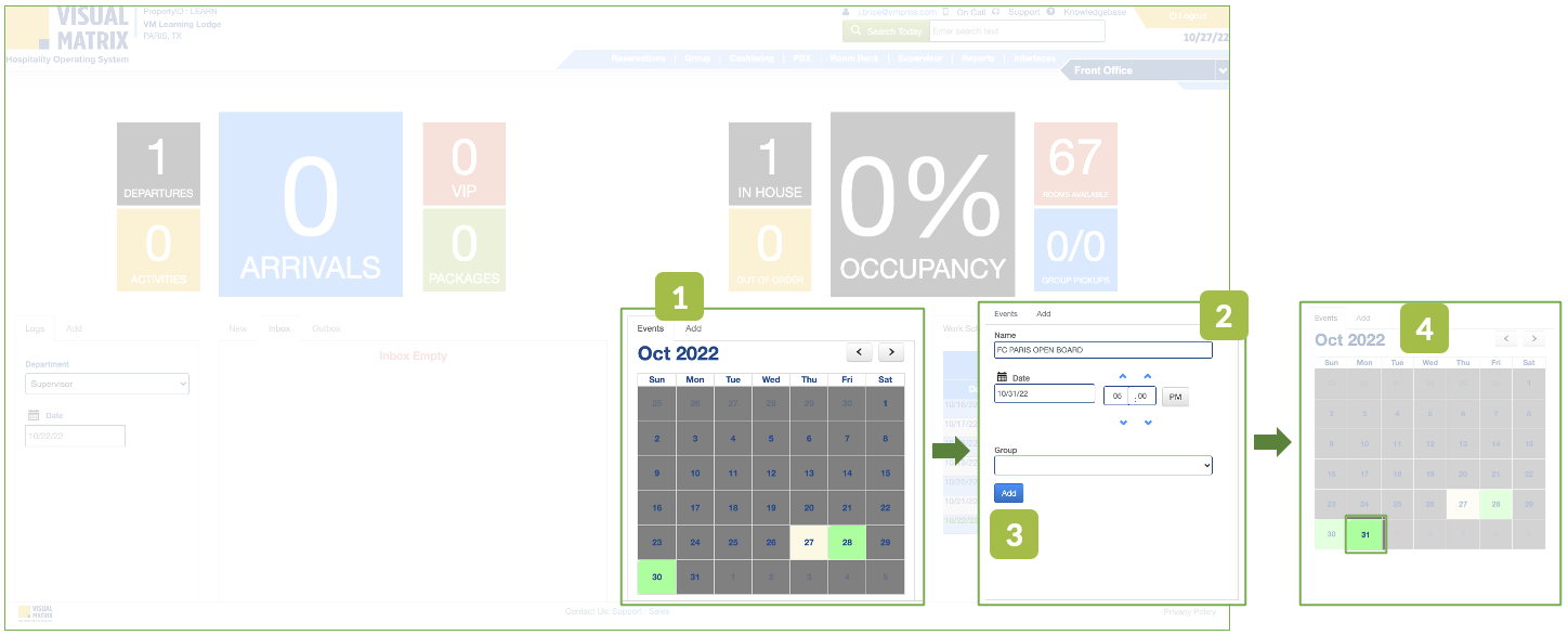 Camino:Front Office > Grupo > Buscar 1. 1. 1. Seleccione Calendario de eventos en el menú de iconos expandible de la derecha. 2. 2. 2. 2. Utilice la fecha del evento para seleccionar para qué fecha de la estancia del grupo será el evento. 3. 3. 3. 3. ...