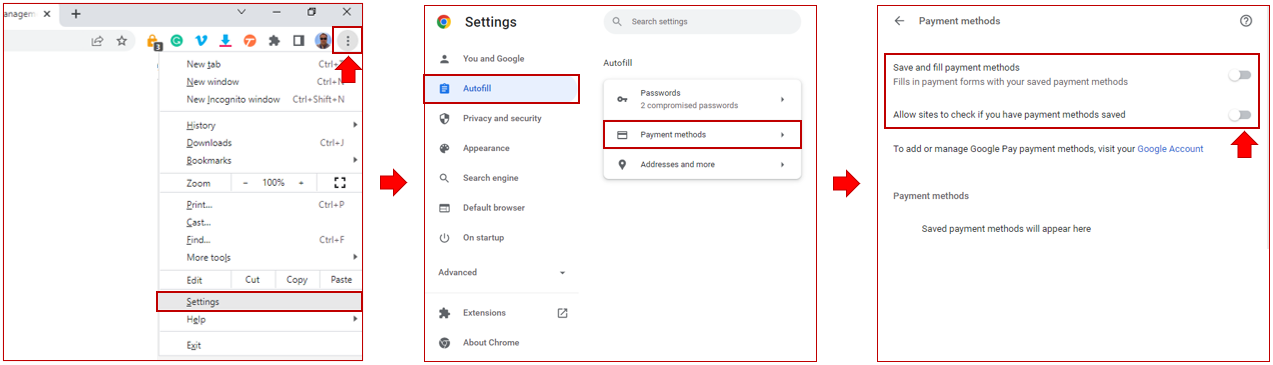 Asegúrese de que ambas opciones - Guardar y llenar métodos de pago y permitir que los sitios comprueben si tiene métodos de pago guardados - estén desactivados.
