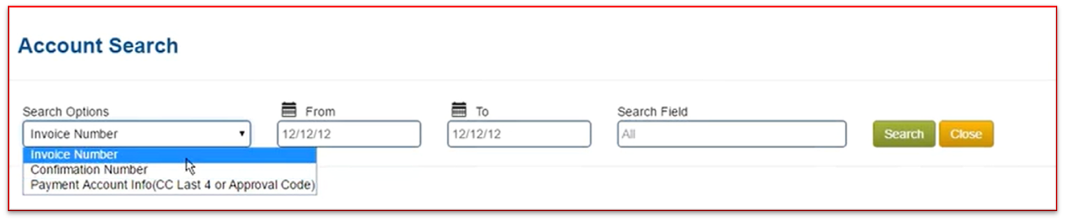 - por número de factura, número de confirmación de folio o información de cuenta de pago (CC últimos 4 dígitos o código de aprobación).