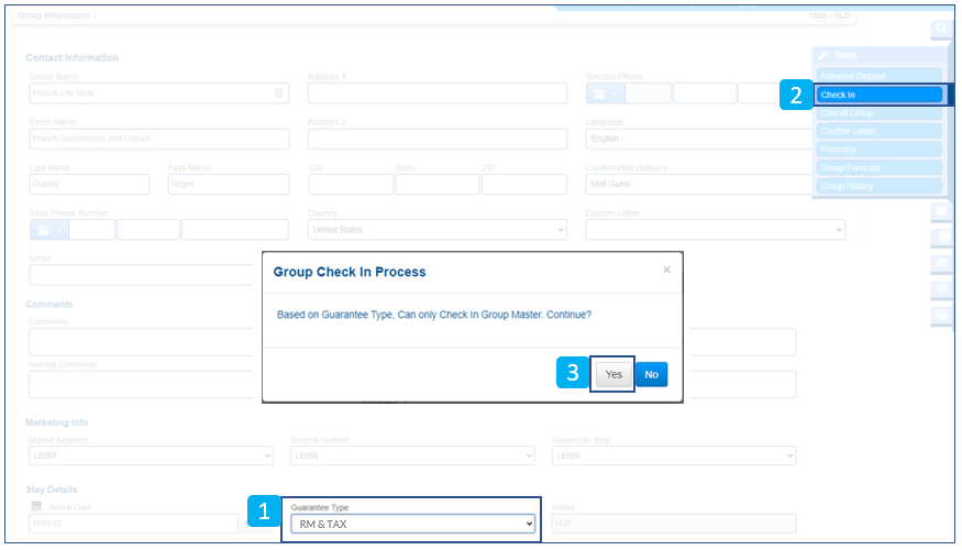 3. 3. 3. 3. Seleccione SÍ en la notificación indicando que solo podrá facturar en el Maestro del Grupo y no en las reservas individuales.Cada reserva dentro del grupo será obligada a proporcionar un método de pago para su propia habitación, ya que se registran individualmente.
