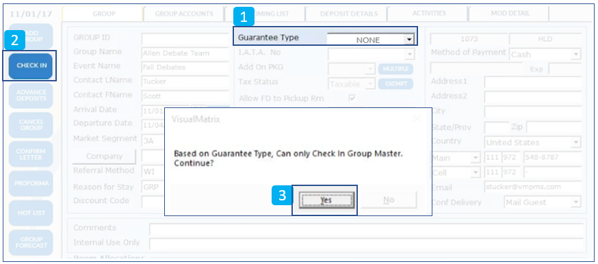 Camino:Front Office > Grupo > Buscar 1. 1. 1. Verifique el tipo de garantía. 2. 2. 2. 2. Selecciona Check In a la izquierda. 3. 3. 3. 3. Usando las casillas de verificación o Seleccionar todo, seleccione qué habitaciones asociadas con el grupo que ...