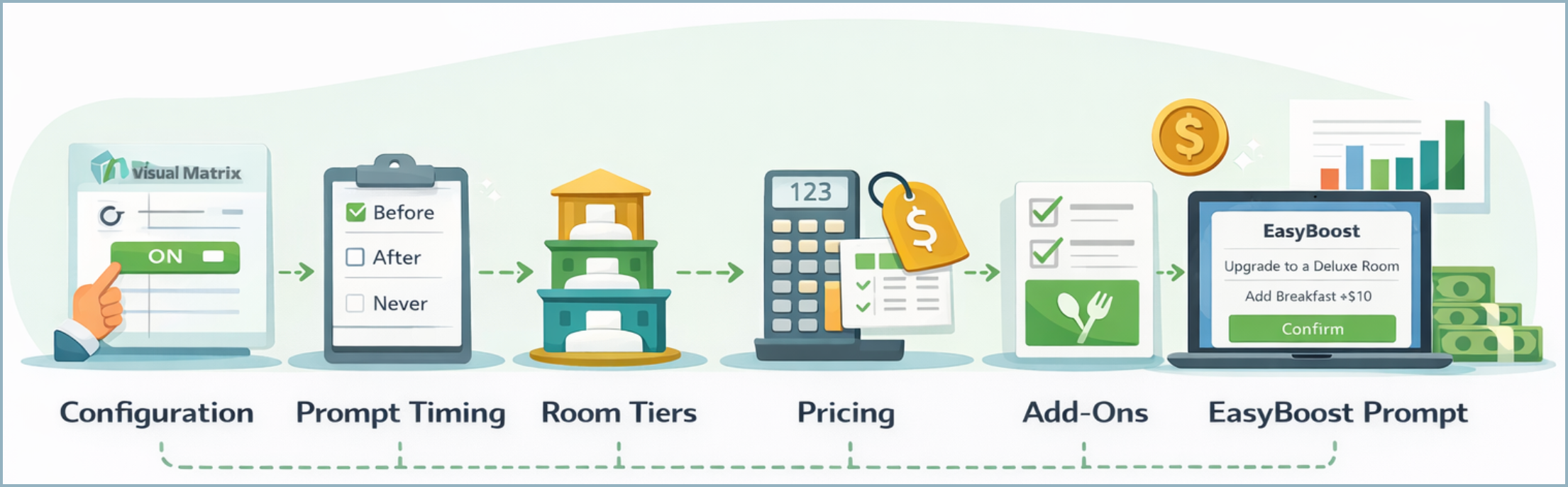 Esta configuración conecta los niveles de habitación, precios, complementos y ajustes de propiedad para que el mensaje EasyBoost pueda presentar las ofertas correctas en el momento adecuado.