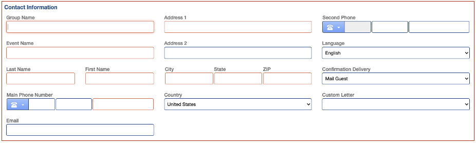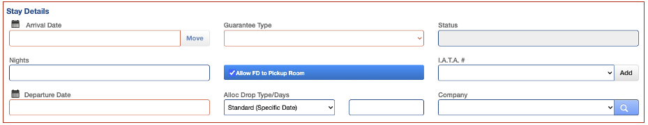 La parte superior de la pantalla Grupo tiene campos para obtener información grupal que rellenará al hacer un bloque de grupo.La parte inferior tiene una ventana de asignación de habitaciones donde agregará asignaciones de tipo de habitación al bloque del grupo.