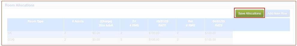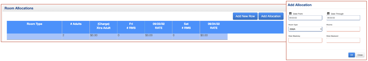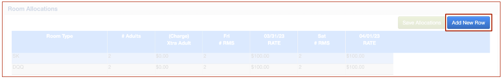 Una vez que guarde el bloque del grupo, el botón Agregar asignación ya no está disponible y tendrá que seleccionar Agregar nueva fila en su lugar.Una vez guardado el bloque de grupo, puede ver, modificar o agregar asignaciones adicionales en la ventana Asignaciones de habitaciones.