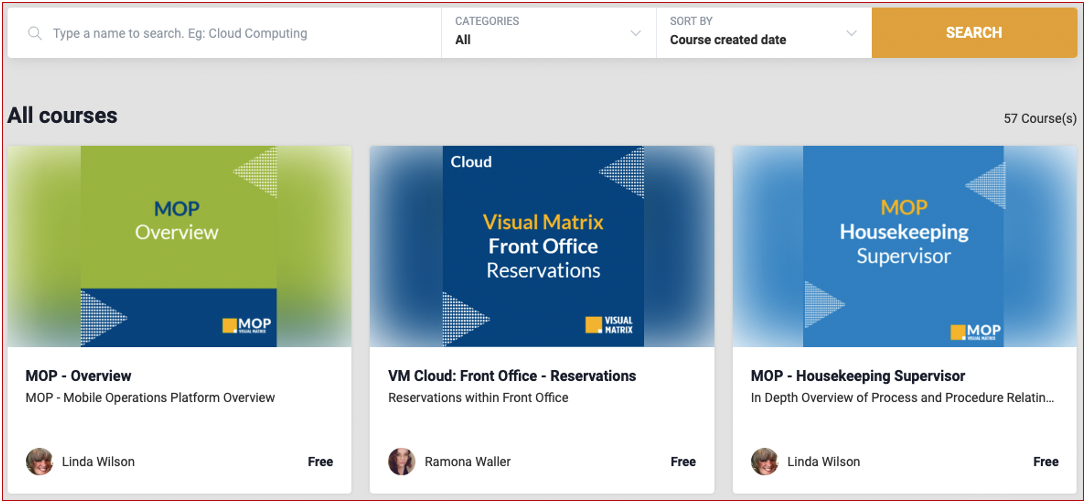 Puede buscar un curso por búsqueda de palabras o por categoría como el departamento, VM Cloud, VM Desktop, VM MOP, Informes, Supervisor, etc.