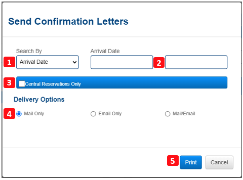 2. 2. 2. 2. Introduzca un intervalo de fechas. Junto con su selección en Search By, todos los huéspedes que estén bajo esos criterios y este intervalo de fechas recibirán una carta de confirmación