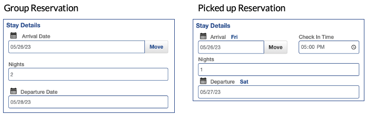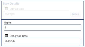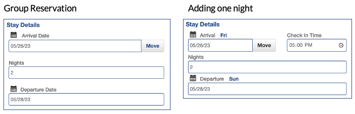 En el ejemplo siguiente, las fechas del grupo son del 05/26/23 a 05/28/23. La reserva fue recogida originalmente solo por una noche de 05/26/23 a 05/27/23.