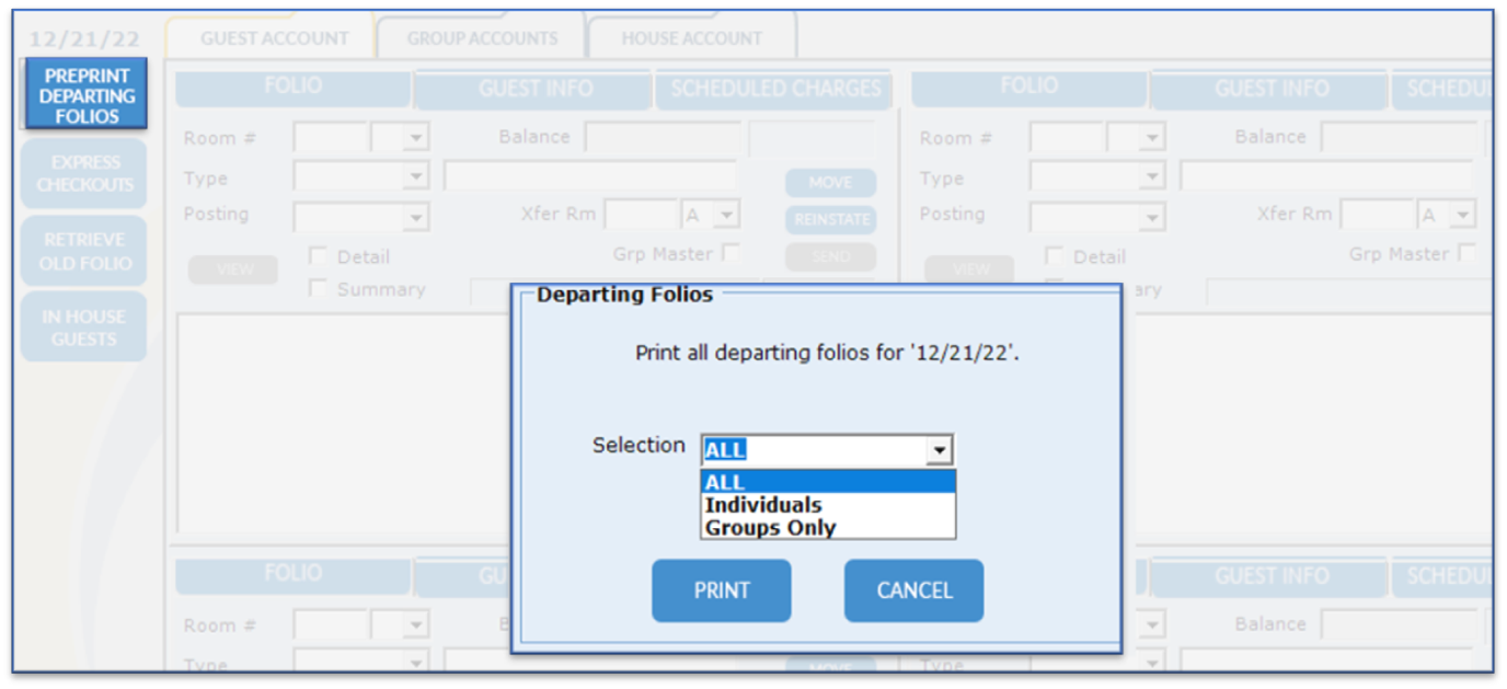- Individuos: Imprima solo a los huéspedes individuales (sin miembros del grupo)
