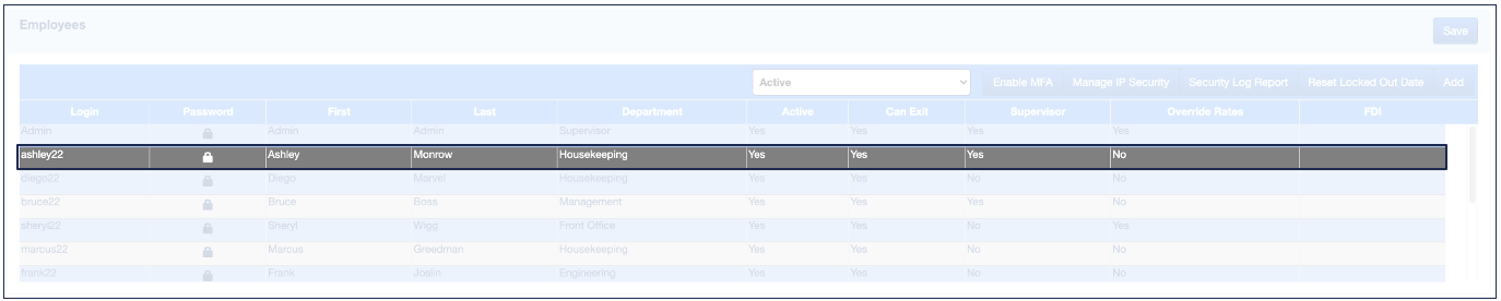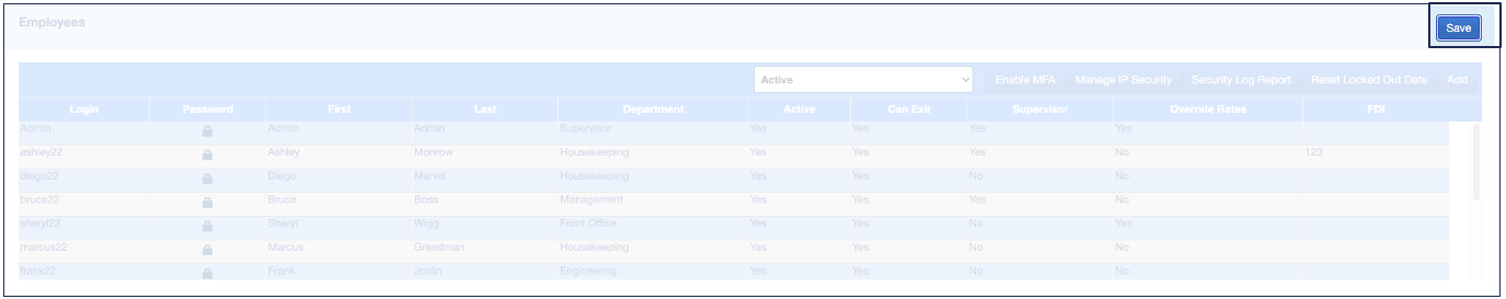 Camino:Gestión > Configuración del usuario > Seguridad 1. 1. 1. Busca el perfil de usuario en la lista. 2. 2. 2. 2. Cambie la columna Activa de Sí a No. 3. 3. 3. 3. Haga clic en Guardar. 4. 4. 4. 4. Si necesita encontrar al usuario de nuevo, cambie ...