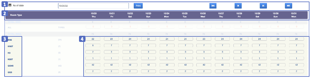 2. 2. 2. 2. Elija el tipo de habitación (3) para el que desea crear una reserva, en función de su disponibilidad (4) para ese día (2).Haga un solo clic en el campo de cruce para una noche y arrastre a través de las fechas requeridas. Siempre puede extender las fechas en la siguiente pantalla.