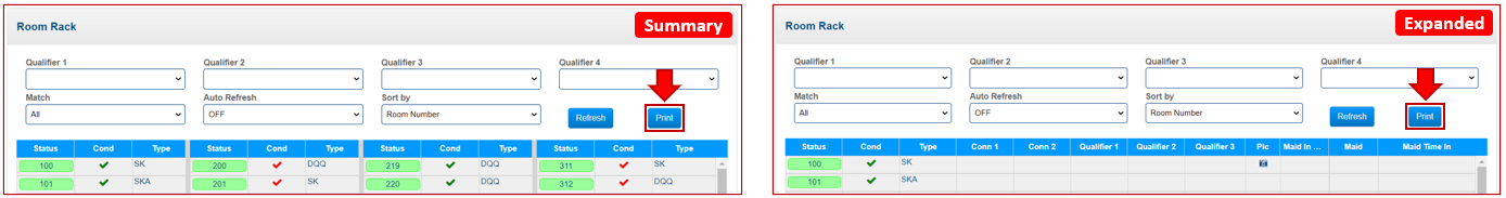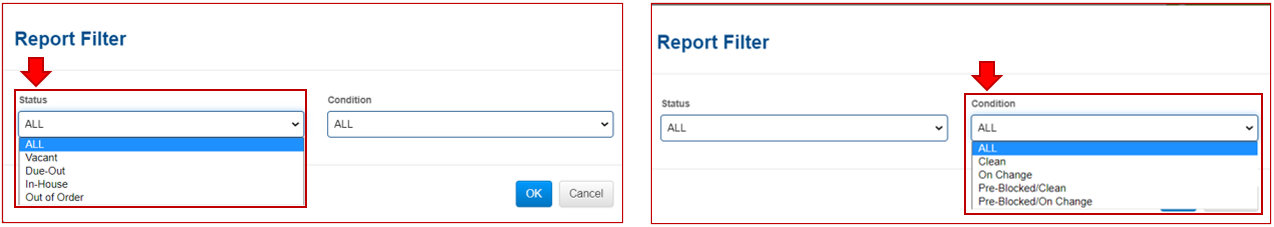 - por estado de la habitación: Vacante, vencido, en casa, fuera de pedido o todo