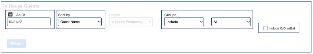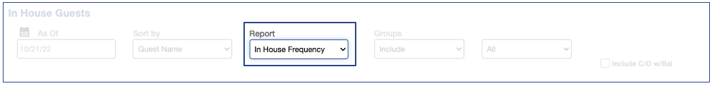 Camino:Front Office > Informes > Oficina Principal > Invitados en casa> Elija la frecuencia del hogar en la parte desplegable del informe.