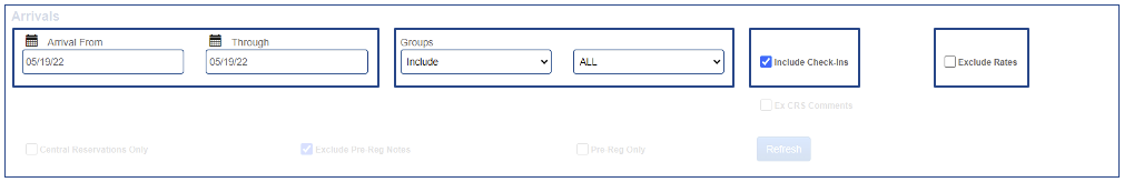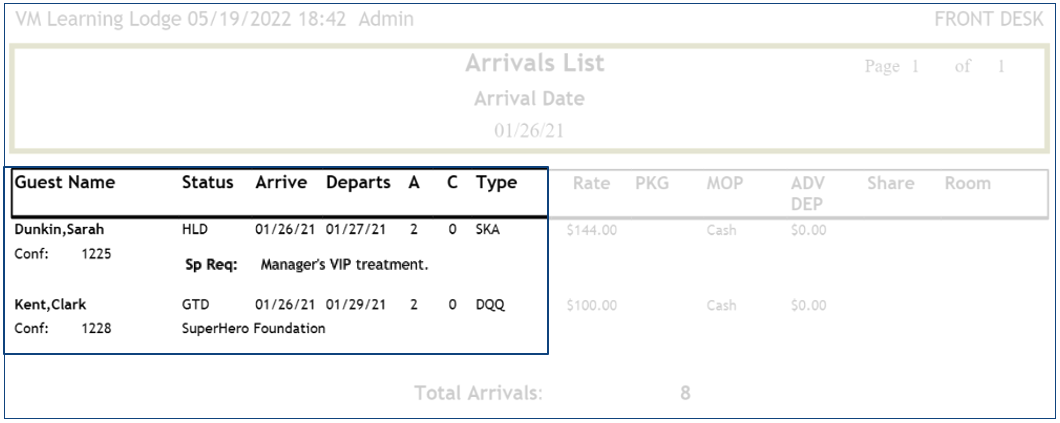 El informe de llegada muestra cada llegada para el día, tanto individuos como grupos.