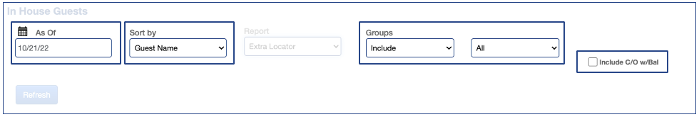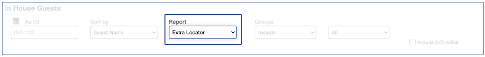 Camino:Front Office > Informes > Oficina Principal > Invitados en casa> Elija Localizador Extra en el menú desplegable Informe.