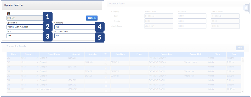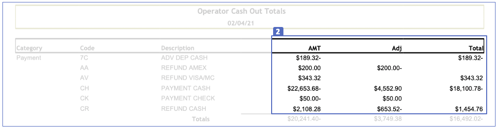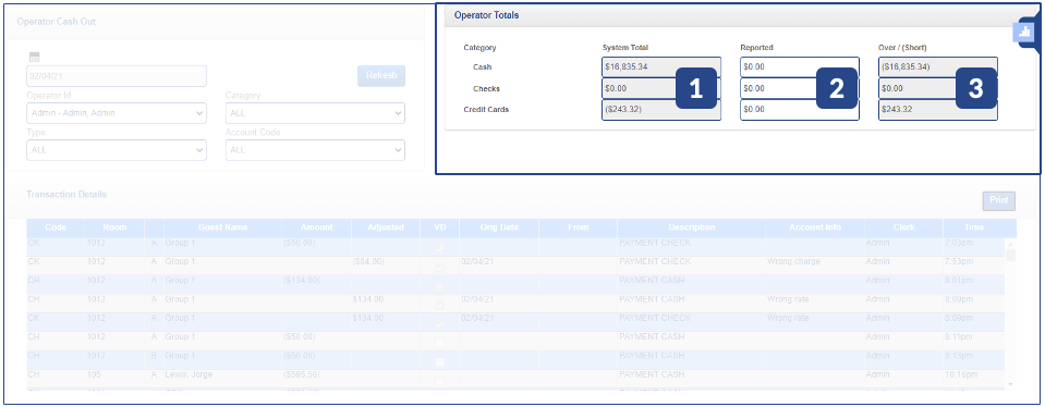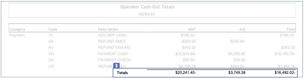 El total del operador muestra el importe total que se ha publicado por categoría de pago (efectivo, cheques o tarjeta de crédito) en función del usuario seleccionado en la sección Salida de efectivo del operador anterior (1).